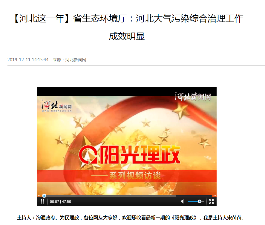 2019年12月10日上午,杏彩(中国)官方网站 二级巡视员陈恩惠带队,与厅大气环境处处长谢文勇、机关党委四级调研员侍孝文一起做客河北新闻网《阳光理政》网络直播间,参加了“河北这一年”《阳光理政》系列视频访谈特别节目。