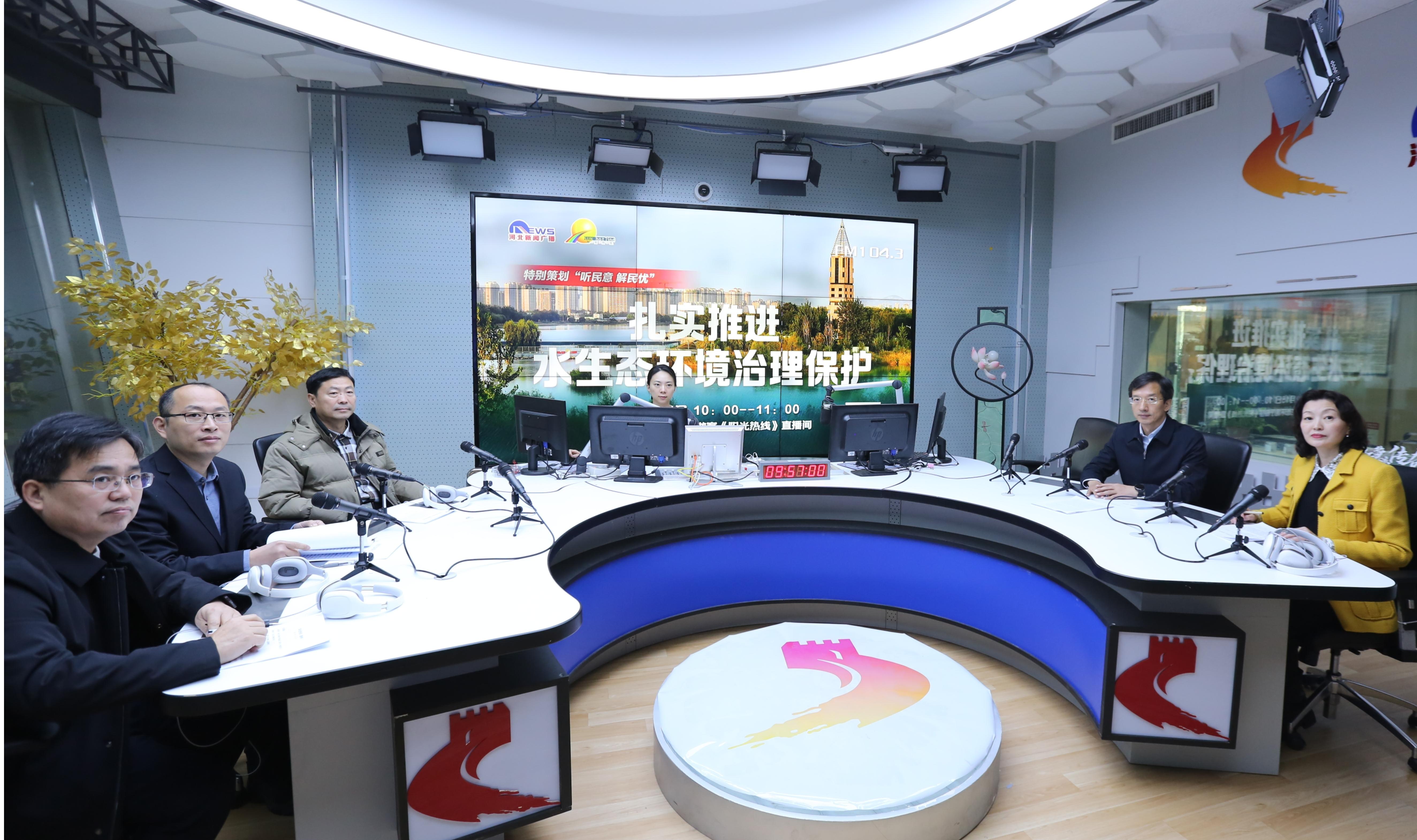2023年12月15日上午,赵宪伟副厅长带队参加了河北广播电视台新闻广播《阳光热线》栏目访谈,节目以现场直播方式进行。此次访谈以“扎实推进水生态环境治理保护”为主题,重点介绍了今年以来我省水生态环境保护、海洋生态环境保护工作进展、成效,以及环评助力绿色发展相关工作情况。厅水生态环境处处长李若玲、海洋生态环境处二级调研员华冰群、环境影响评价与排放管理处副处长石建诗、生态环境信访处副处长李远一同参加了访谈。在节目直播过程中,还通过接听热线电话,与听众进行了互动交流。