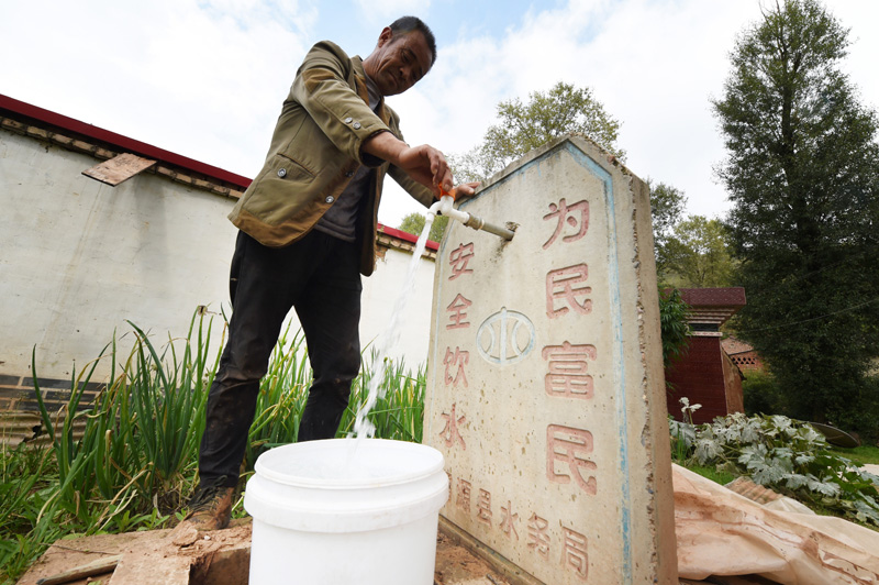 甘肃省定西市渭源县元古堆村村民在自来水龙头前接水(2019年9月3日摄)。新华社记者 范培珅 摄