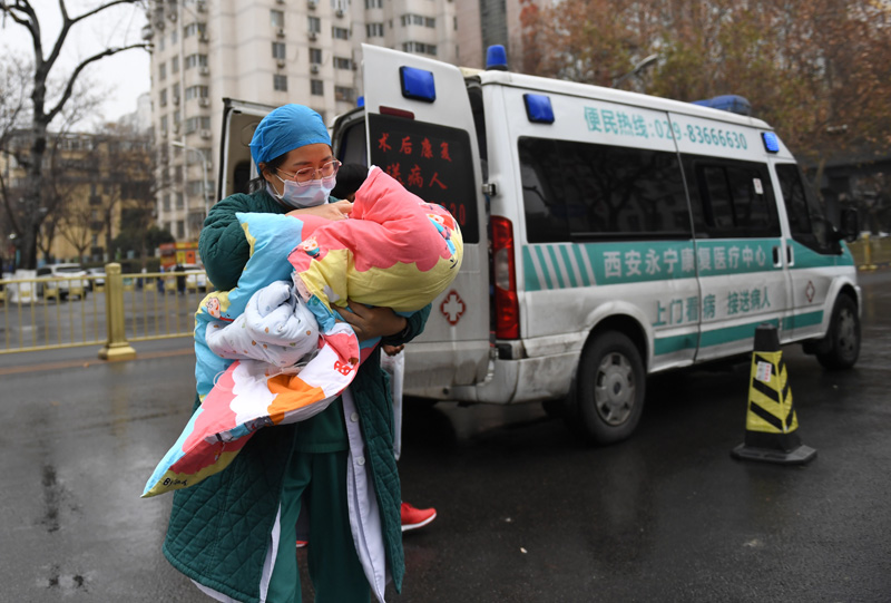 在西安交通大学第二附属医院,儿科医生王莉接诊一名被救护车转运就医的婴儿(1月8日摄)。新华社记者 李一博 摄