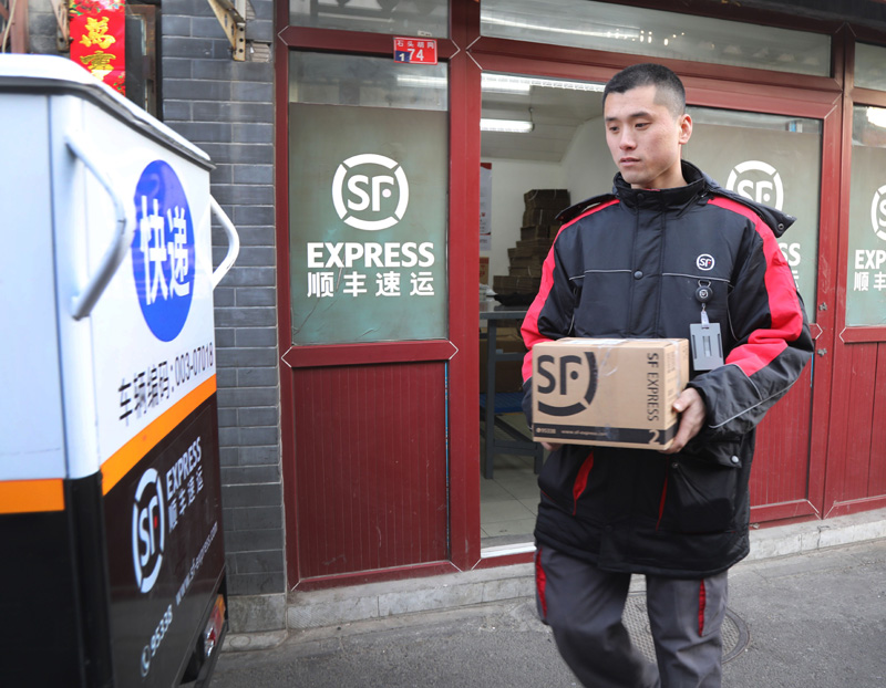 顺丰北京石头胡同营业站“快递小哥”刘阔在整理包裹(2019年2月1日摄)。新华社记者 李德欣 摄