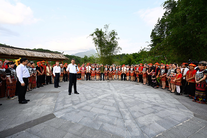4月10日至13日,中共中央总书记、国家主席、中央军委主席习近平在海南考察。这是11日下午,习近平在五指山市水满乡毛纳村同村民们亲切交流。新华社记者 李学仁 摄