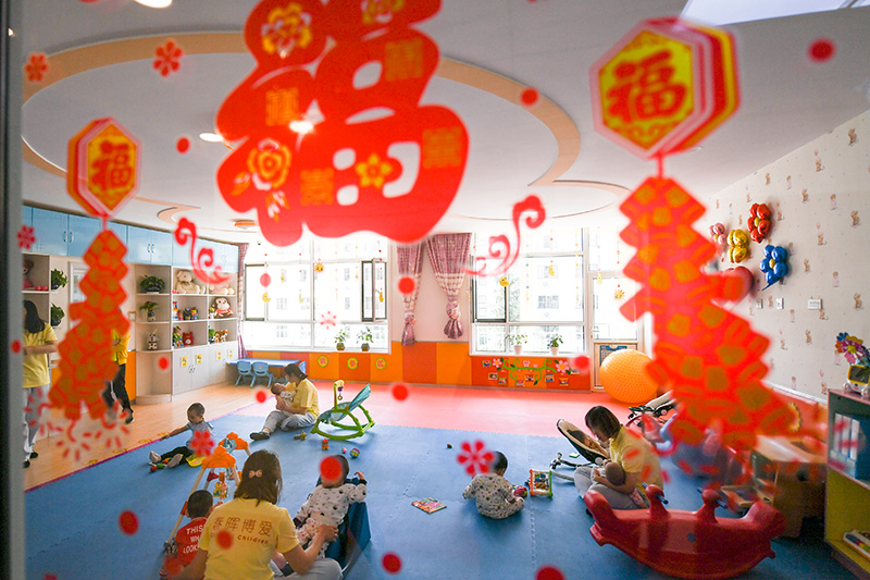 在呼和浩特市儿童福利院,教职工在陪伴儿童们玩耍(2019年5月28日摄)。新华社记者 王靖 摄