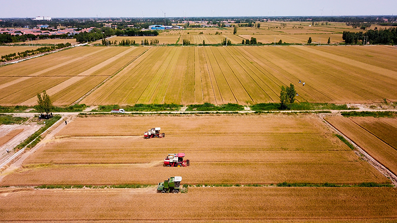 2022年6月7日,在山东省惠民县桑落墅镇,农民驾驶农机收获小麦(无人机照片)。新华社记者 郭绪雷 摄