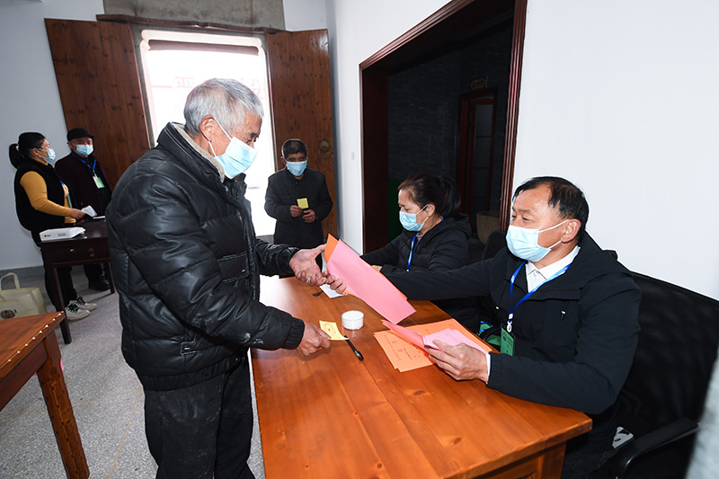 村民在浙江省杭州市临安区湍口镇迎丰村的基层投票点领取选票参加基层人大换届选举投票(2021年12月14日摄)。新华社记者 徐昱 摄