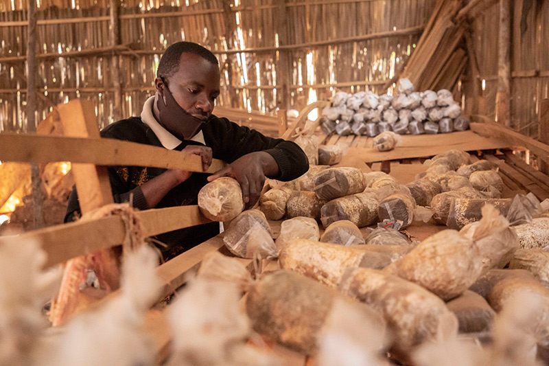 在卢旺达首都基加利的一家食用菌培育作坊,作坊主人埃马纽埃尔·阿希马纳检查菌袋(2020年9月9日摄)。中国福建农林大学的菌草专家2006年来到卢旺达开始菌草技术合作项目,在当地示范和推广菌草技术。新华社发(西里尔·恩德格亚 摄)