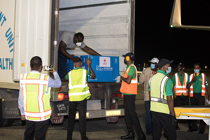 工作人员在圭亚那首都乔治敦国际机场搬运中国援助的新冠疫苗(2021年3月2日摄)。新华社发(圭亚那新闻署供图)