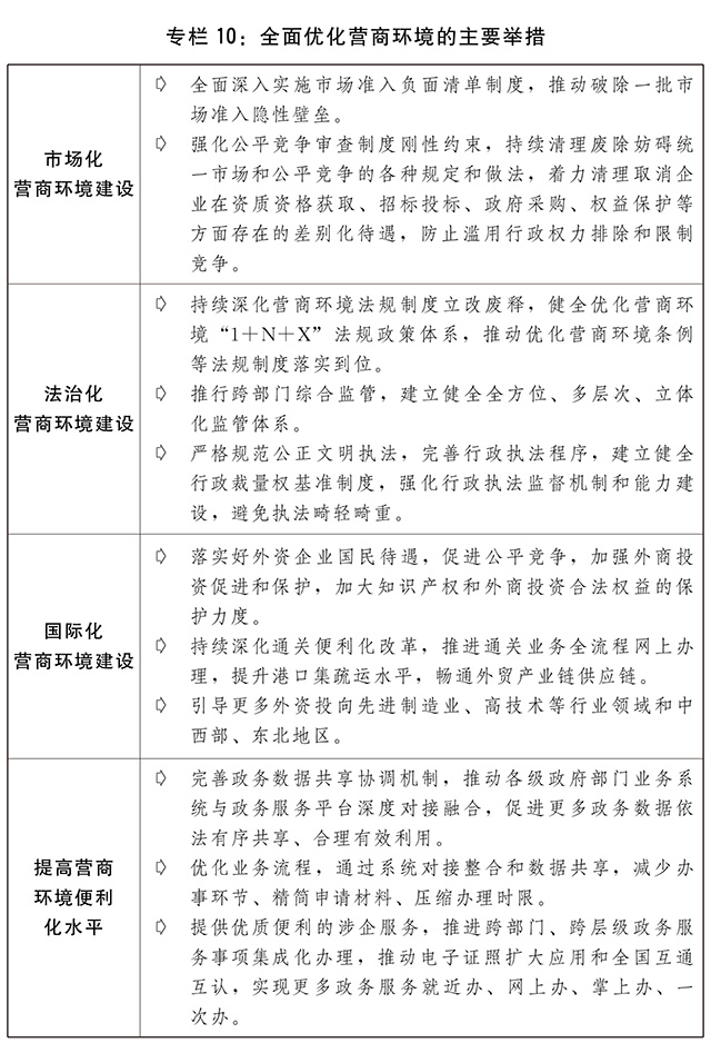 三是营造市场化法治化国际化一流营商环境。深化简政放权、放管结合、优化服务改革。坚持依法行政,严格规范公正文明执法,带头遵守契约,提高政府公信力和执行力。强化公平竞争审查制度刚性约束,持续清理修改不符合优化营商环境条例的规章和规范性文件,推动各地结合实际出台配套政策措施,促进全国范围营商环境持续改善。深化营商环境创新试点,支持有条件的地方率先加大营商环境改革力度。不断优化中国营商环境评价体系,健全中国营商环境评价长效机制。制定进一步提升重点区域、工业园区等营商环境水平的行动方案,推动城市群、都市圈等重点区域营商环境一体化发展。推动建立涉企收费长效监管机制。充分发挥全国一体化政务服务平台“一网通办”枢纽作用,深入推进“一件事一次办”改革举措,加快电子证照应用,持续提升政务服务“跨省通办”质效。建立企业信用状况综合评价体系,强化企业信用风险分类管理,完善社会信用统一代码制度,加强信用信息共享应用,促进中小微企业融资便利。