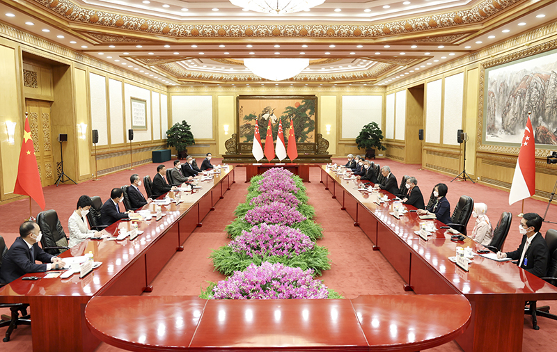 习近平指出,中新是重要合作伙伴,中新关系始终展现出前瞻性、战略性、示范性,不仅有力推动了两国各自发展振兴,也为地区国家树立了标杆。中方把新加坡置于周边外交优先方向。你此次访华期间,我们把中新关系提升为全方位高质量的前瞻性伙伴关系,为两国关系未来发展指明了方向。中方愿同新方加强战略沟通,深化战略对接,切实使“高质量”成为中新合作最鲜明的标识。