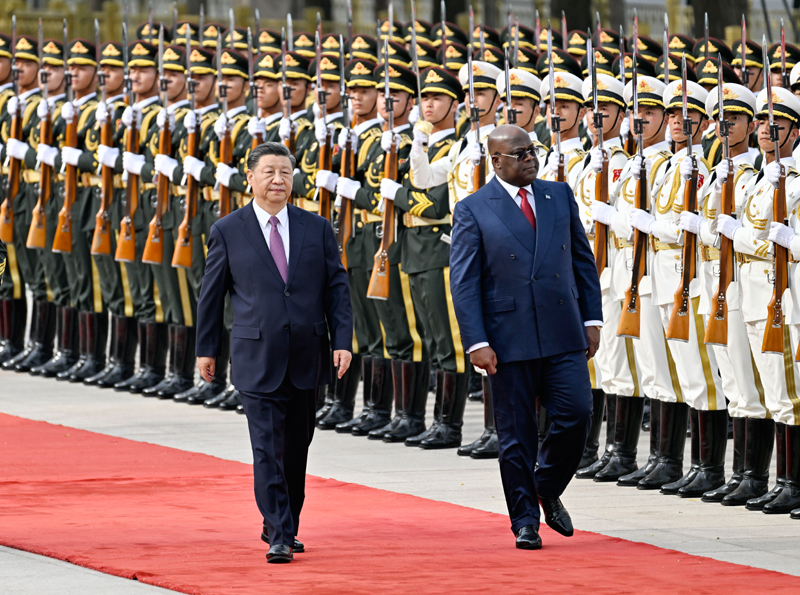 5月26日下午,国家主席习近平在北京人民大会堂同来华进行国事访问的刚果(金)总统齐塞克迪举行会谈。这是会谈前,习近平在人民大会堂东门外广场为齐塞克迪举行欢迎仪式。新华社记者 刘卫兵 摄