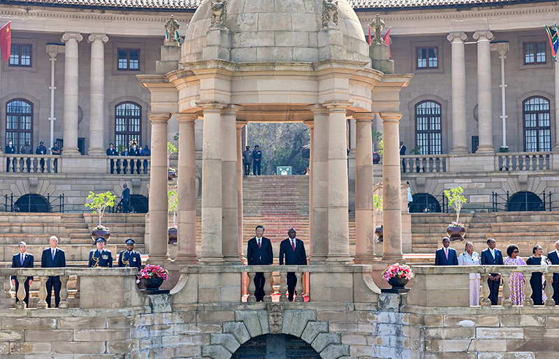 8月的比勒陀利亚,晴空万里,惠风和畅。总统府广场鲜花盛开,中南两国国旗迎风飘扬。在总统摩托车队护卫下,习近平乘车抵达总统府,拉马福萨在下车处热情迎接。两国元首登上检阅台。仪仗队行持枪礼,军乐队奏中南两国国歌,现场鸣放21响礼炮。习近平检阅南非仪仗队。两国元首同双方陪同人员一一握手。