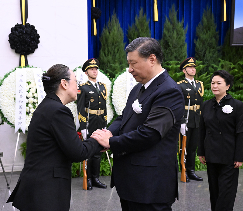 11月2日,李克强同志遗体在北京八宝山革命公墓火化。习近平、李强、赵乐际、王沪宁、蔡奇、丁薛祥、李希、韩正等前往八宝山送别,胡锦涛送花圈表示哀悼。这是习近平与李克强亲属握手,表示深切慰问。新华社记者 谢环驰 摄