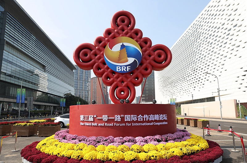 这是2023年10月17日在北京国家会议中心附近拍摄的“一带一路”国际合作高峰论坛景观布置。新华社记者 陈斌 摄