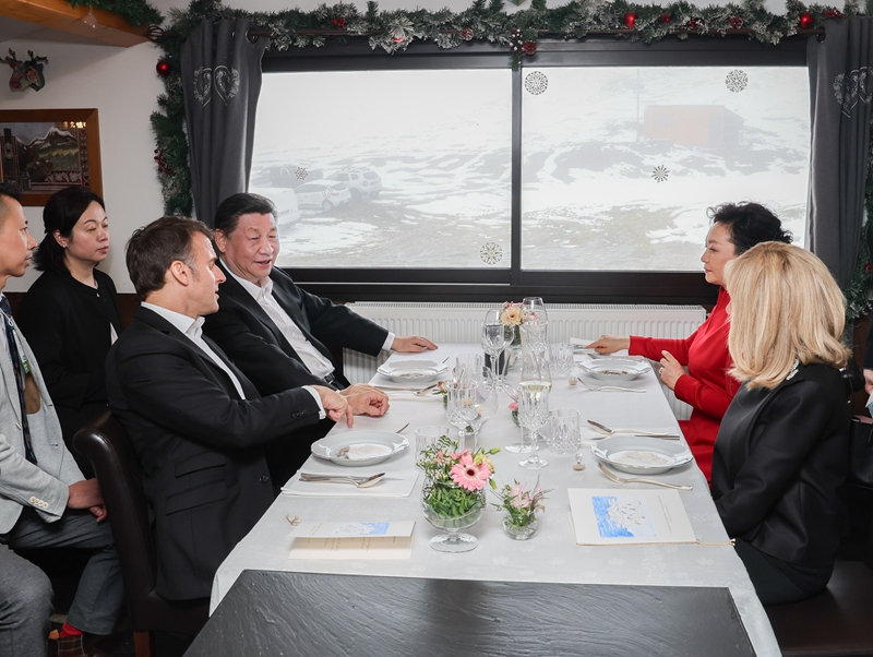 马克龙总统和布丽吉特在图尔马莱山口“牧羊人驿站”迎接习近平和彭丽媛,共同欣赏当地村民表演的具有浓郁南法风情的牧羊人之舞,并同他们亲切合影。