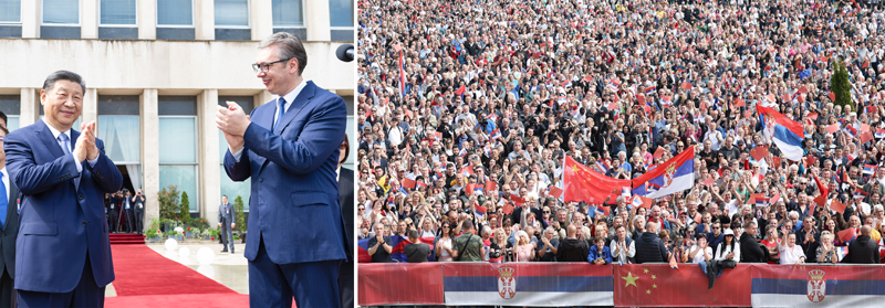 当地时间5月8日上午,国家主席习近平在贝尔格莱德塞尔维亚大厦同塞尔维亚总统武契奇举行会谈。会谈前,武契奇陪同习近平来到政府大厦平台(左图)。大厦广场上,一万五千名塞尔维亚民众挥舞中塞两国国旗,对习近平表示最热烈的欢迎(右图)。(拼版照片)新华社记者 黄敬文 丁海涛 摄