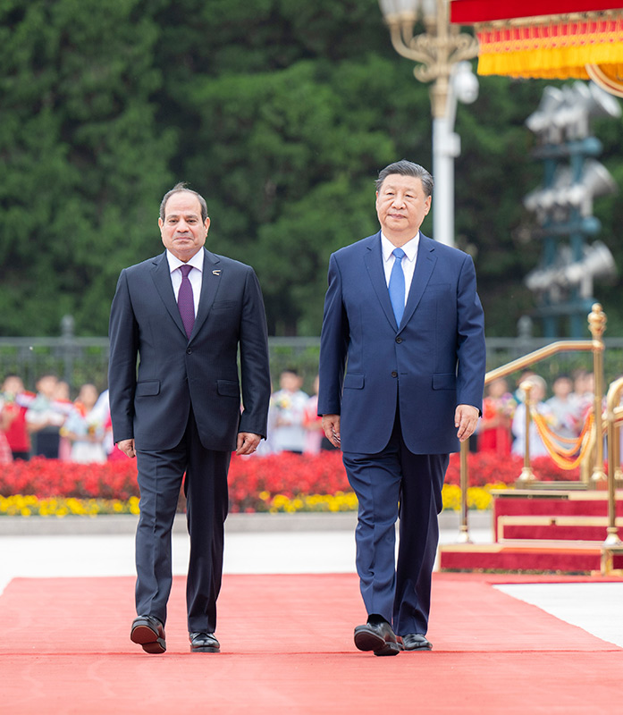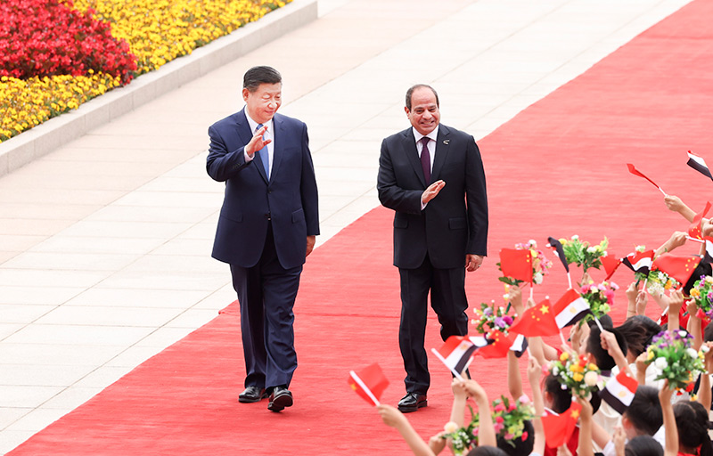 5月29日下午,国家主席习近平在北京人民大会堂同来华出席中国-阿拉伯国家合作论坛第十届部长级会议开幕式并进行国事访问的埃及总统塞西举行会谈。这是会谈前,习近平在人民大会堂东门外广场为塞西举行欢迎仪式。新华社记者 翟健岚 摄