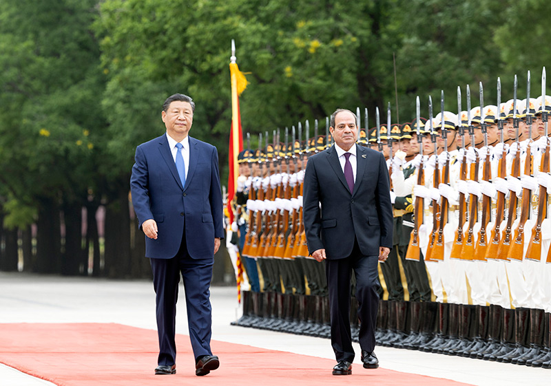 塞西抵达时,礼兵列队致敬。两国元首登上检阅台,军乐团奏中埃两国国歌,天安门广场鸣放21响礼炮。塞西在习近平陪同下检阅中国人民解放军仪仗队,并观看分列式。