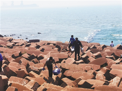 图为:唐山市环境监控中心的工作人员正在对首钢京唐入海排污口开展监督性监测。