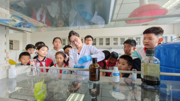 在理化实验室,实验员现场演示了一台酸碱反应趣味小实验。实验员将紫甘蓝水分别滴入白醋、小苏打、纯水溶液中,每一种溶液都呈现出不一样的颜色,让小读者们感受到了化学反应的神奇。通过一系列趣味实验和实验员的耐心讲解,小读者们在轻松愉快的氛围中获得了丰富的生态保护知识。