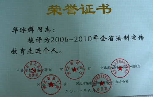 在“五五”普法期间,由于我厅对“五五普法”工作领导有力,措施得力,活动给力,取得了突出成绩,政策法规处被授予“2006-2010年全省法制宣传教育先进集体”称号,华冰群副处长被授予“2006-2010年全省法制宣传教育先进个人”称号。