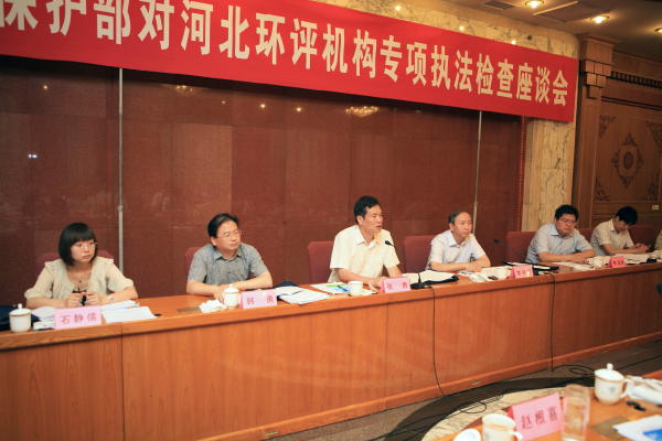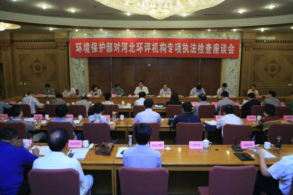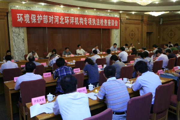 7月11日上午,环境保护部对河北省环境影响评价机构专项检查座谈会在河北会堂召开。杨智明副厅长汇报了我省对环评机构的管理情况,检查组组长、重庆市环保局张勇副局长说明了此次检查的具体工作安排,并提出了明确要求。会议还听取了石家庄、承德、唐山市环保局对本地环评机构检查的工作汇报,听取了河北省环境科学研究院、河北冀都环保科技有限公司、河北众诚能源环保科技有限公司开展环境影响评价工作的汇报。省环保厅环评处、省环境工程评估中心、各设区市环保局环评管理部门、全省环评机构有关代表参加了会议。会议由环保部环评司项目环评一处常仲农处长主持。