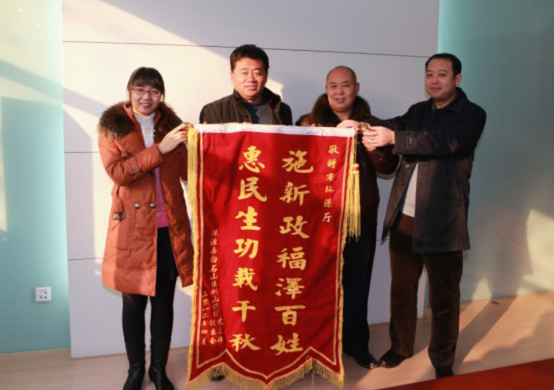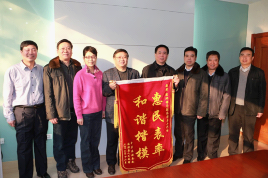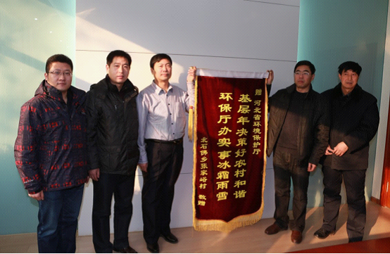 为感谢省环保厅驻村工作组在基层建设年帮扶工作中做出的突出贡献,感谢省环保厅对涞源县的支持和厚爱,由涞源县委书记高文才带队的县、乡、村三级干部一行10人专程赶到石家庄,高文才书记亲手将一面“惠民表率、和谐楷模”的锦旗送到杨智明副厅长的手中,所帮扶的涞源县荆山口村和张家裕村的村支部书记也分别将锦旗送到了驻村队员手中,感谢省环保厅驻村工作组对这两个村的真情帮扶,对驻村队员尽心尽力的办事态度和实实在在的服务精神给予了高度赞扬。