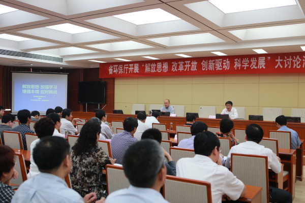 5月14日,省环保厅组织“解放思想、改革开放、创新驱动、科学发展”大讨论活动专题学习,邀请环保部宣教中心主任贾峰作了《解放思想 加强学习 增强本领 应对挑战》的专题讲座。陈国鹰厅长等厅领导、厅机关全体人员、厅属各单位中层以上干部聆听了讲座,杨智明副厅长主持学习活动。