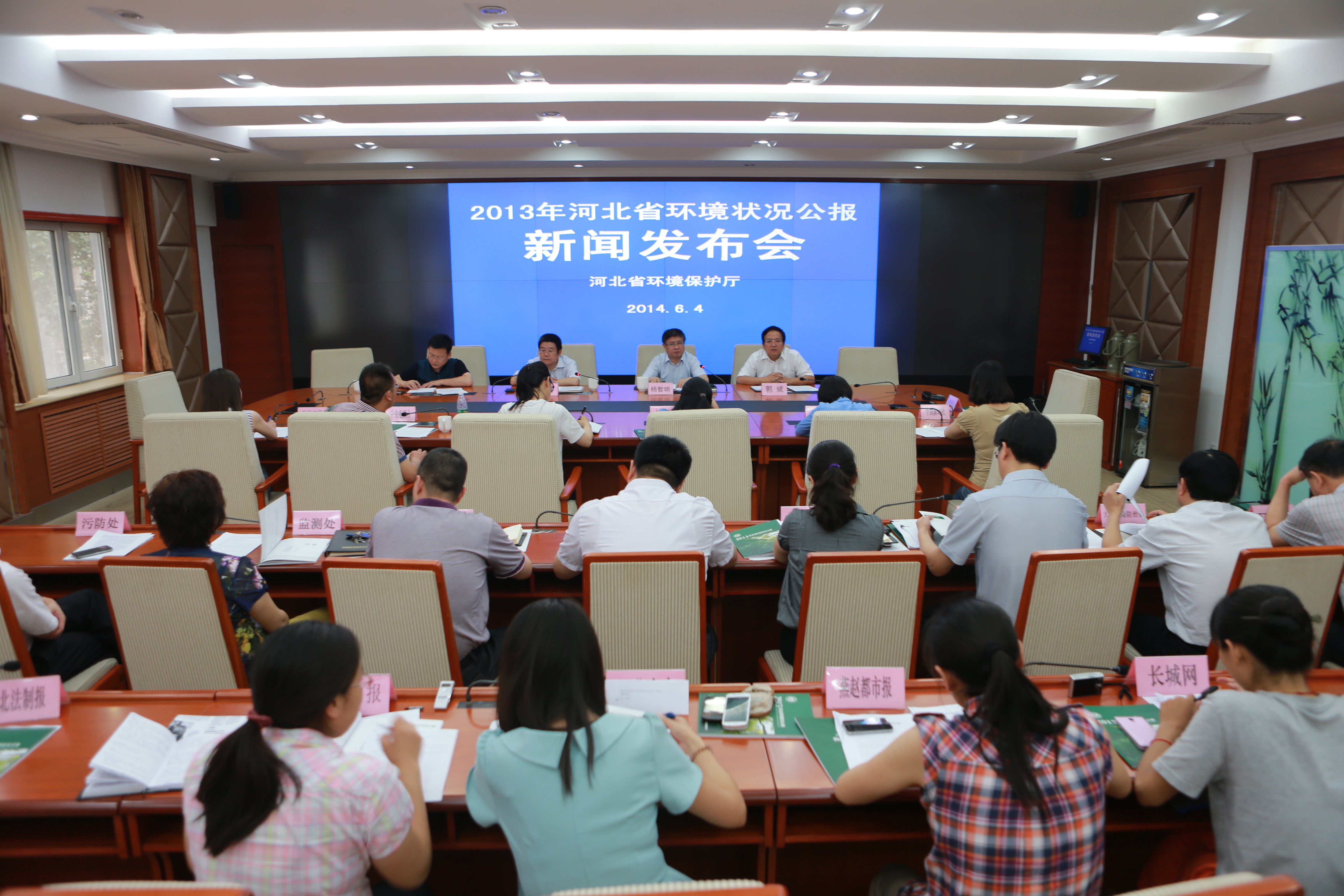 6月4日下午,省环保厅在机关新闻发布中心召开新闻发布会,发布2013年河北省环境状况公报。会上省环保厅副厅长、新闻发言人杨智明致发布词并就相关问题答记者问。本次发布会特别邀请了省气象局首席气象服务专家郭迎春、河北科技大学教授郭斌作为专家出席发布会并就相关问题回答记者提问。发布会由宣教中心主任潘井泉主持。 《公报》显示2013年全省污染减排工作取得了新进展,化学需氧量、氨氮、二氧化硫和氮氧化物的排放量与2012年相比,分别削减了2.90%、3.51%、4.20%和6.17%,均完成了年初的既定目标。 杨智明表示,2013年,全省把环境保护作为保障和改善民生的一项重要任务,加大环境治理和生态保护工作力度、投资力度、政策力度,以解决损害群众健康突出环境问题为重点,坚持预防为主、综合治理,强化水、大气、土壤等污染防治,着力推进重点流域和区域水污染防治,着力推进重点行业和重点区域大气污染治理。据统计,全省设区城市空气优良天数平均为129天;全省七大水系Ⅲ类和好于Ⅲ类水质的断面比例达48.57%,主要污染物氨氮平均浓度比上年升高20.25%,化学需氧量平均浓度比上年降低8.22%;水库水质良好,近岸海域水质基本保持良好;声环境质量总体为较好。 人民日报河北分社、新华社河北分社、河北日报、河北人民广播电台、燕赵都市报、长城网等多家中央驻冀媒体及省内主要媒体参加了发布会。