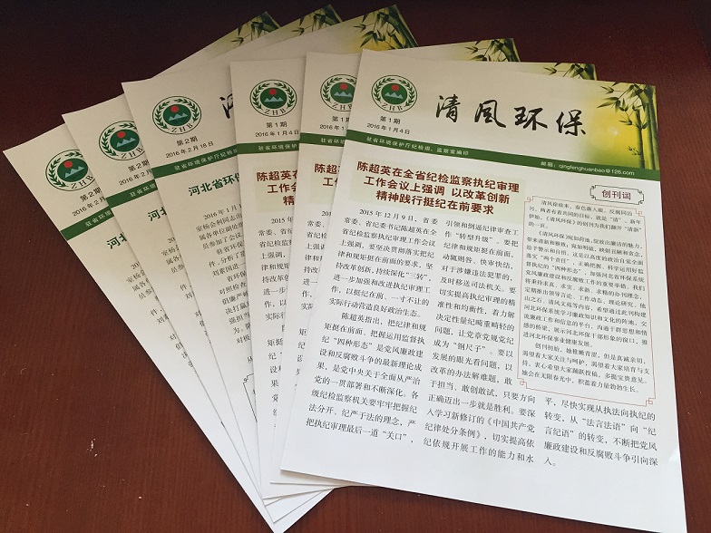 驻省环保厅纪检组秉持求真、求实、求新、求精的办刊理念,创办期刊《清风环保》,打造全省环保系统反腐倡廉宣传新媒介。该刊以月刊形式定期推出领导言论、工作动态、理论研究、他山之石、清风文苑、观点锐评等内容,并向驻环保部纪检组监察局、省纪委及全省环保系统赠阅。此举是省环保厅党组及驻厅纪检组落实“两个责任”,加强河北省环保系统党风廉政建设和反腐败工作的重要举措,以此构建河北环保系统宣传廉政知识和文化的阵地,交流廉政工作和信息的平台,展示河北环保干部形象的窗口。目前,该刊已推出两期,并引发一定回应和好评。