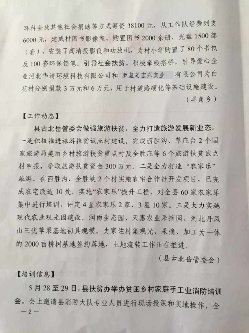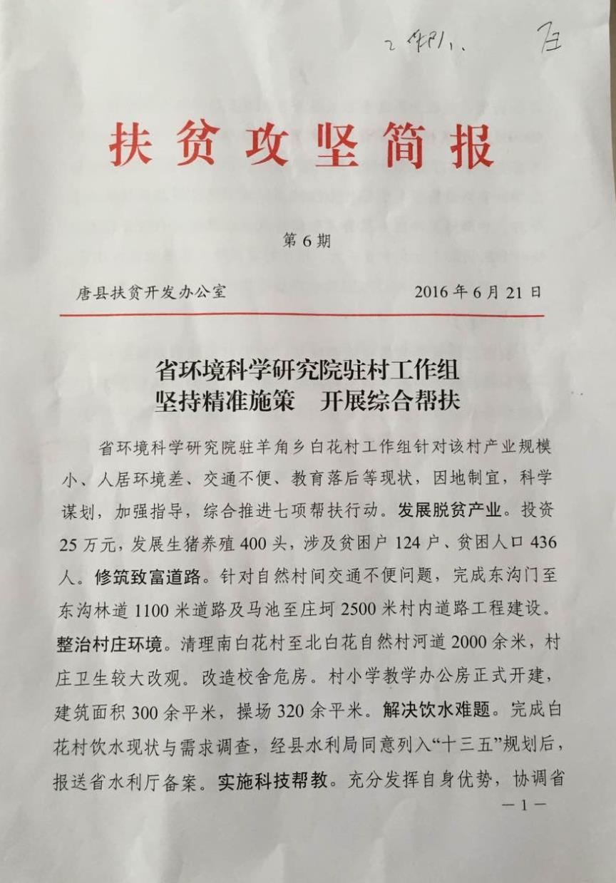 河北省环境科学研究院精准脱贫驻村工作组入驻以来开展的工作受到白花村村民的认可。县、乡两级政府也对省环科院,对驻村工作组的取得的成绩进行了好评。唐县扶贫办于2016年6月21日,在《脱贫攻坚简报》(第六期)对河北省环科院及驻村工作组提出了表扬。简报附后。