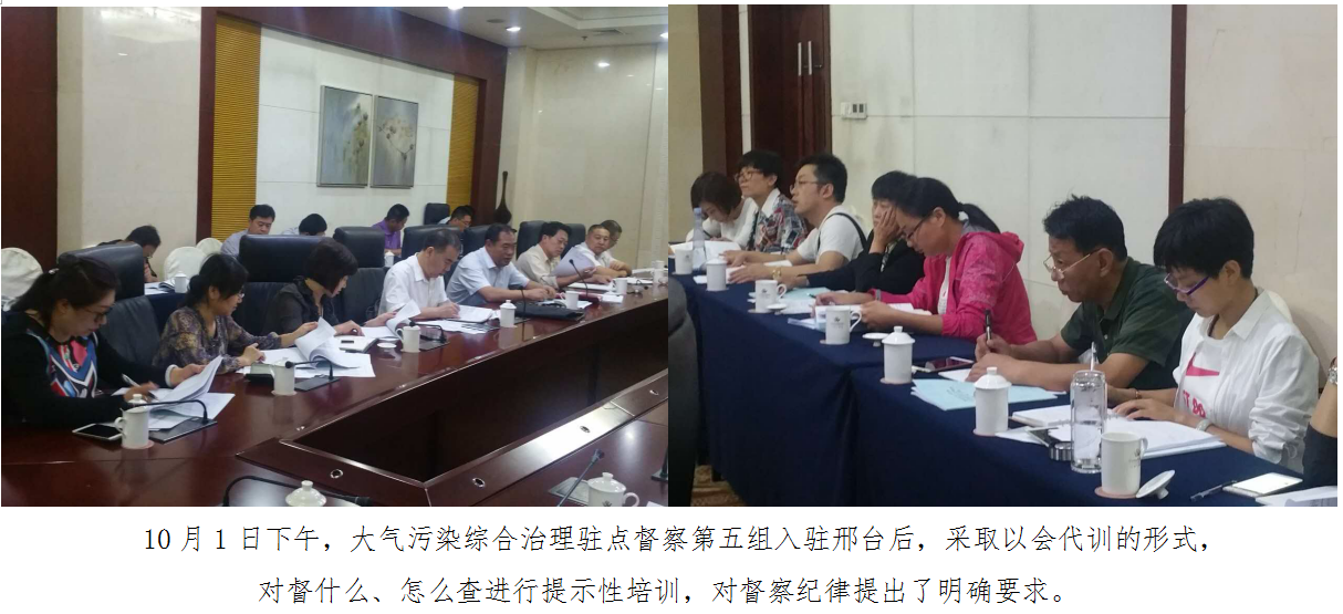 10月1日下午,大气污染综合治理驻点督察第五组入驻邢台后,利用2个小时时间,采取以会代训的形式,对督什么、怎么查进行了提示性培训,对督察纪律提出了明确要求。督察五天来,邢台督导组全体人员勇于担当、严督细查、方法多样,高标准开展了专项督查工作。截止到10月5日,共发现问题73个,已全部交办当地政府整改落实。