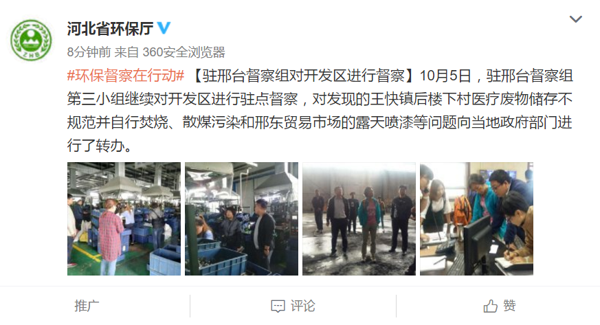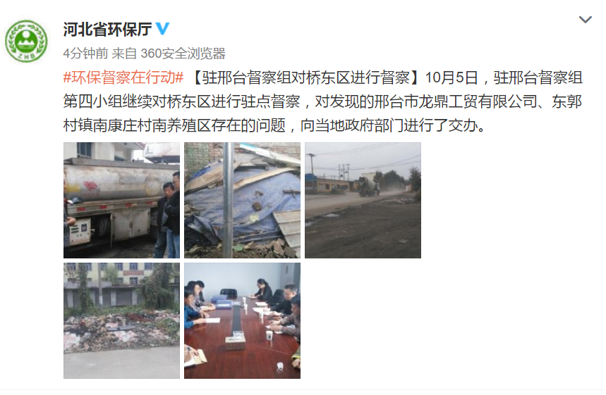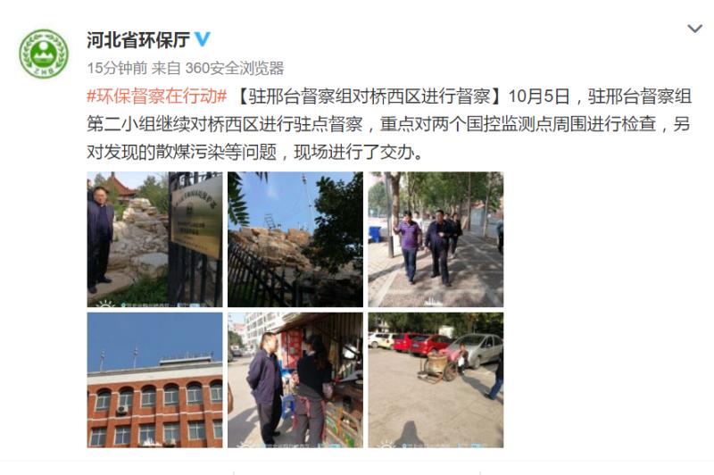 督察中坚持四个结合,即驻点督察与机动巡视相结合,五个专项督察小组分别驻临城县、南和县、桥西区、桥东区和开发区进行督察,机动巡视组在完成资料汇总的基础上,对5个督察小组进行现场指导,协调解决有关问题,并对任县、内丘县和邢台县开展了机动巡查;总结经验与查找问题相结合,始终坚持问题导向,把查找问题作为重点,促进整改落实。同时注意总结推广各县大气污染治理成功做法,相互学习促进;日查与夜查相结合,在走访座谈、查阅资料、现场核查污染点位的基础上,对已经停产但可能存在夜间生产的企业、餐饮服务网点开展夜查;督察交办与整改落实相结合,在督查中被发现的问题,立即交办当地政府,采取回头看的办法,督导当地政府整改到位。目前,邢台督察组正在组织对督导中发现的因失职失责导致工作推进不力的或重大问题进行梳理,做好补充调查等工作,适时按照量化问责办法启动问责程序,使督察过程真正成为压力传导过程,变为整改落实的过程。