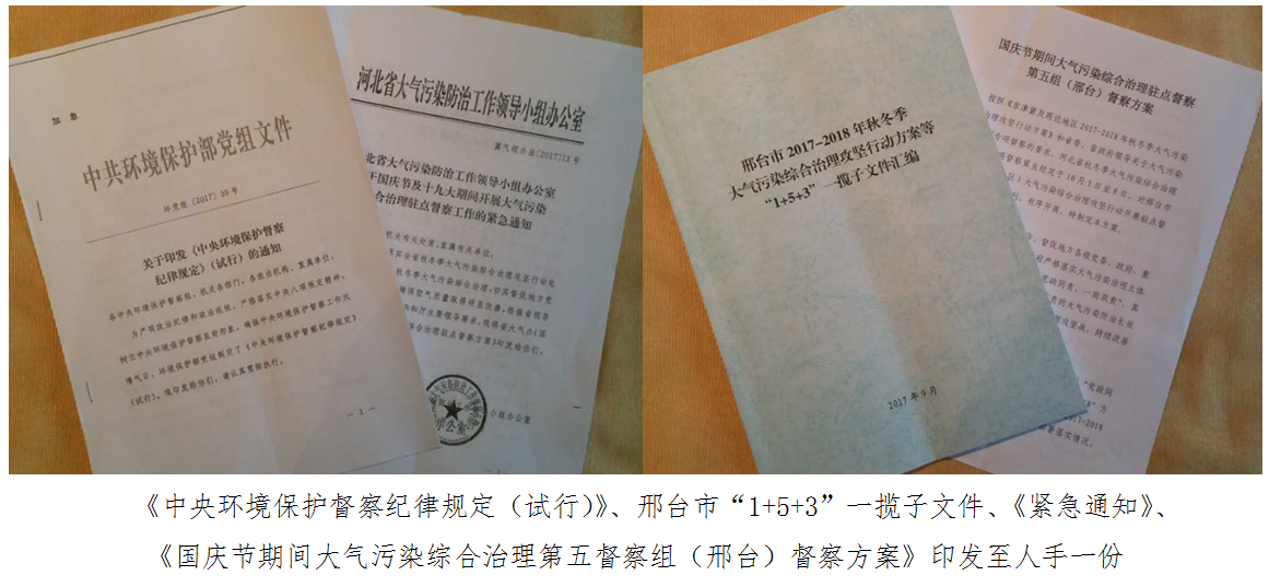 邢台组将《中央环境保护督察纪律规定(试行)》、邢台市“1+5+3”一揽子文件、《紧急通知》、《国庆节期间大气污染综合治理第五督察组(邢台)督察方案》印发至人手一份,梳理了有关县(区)中央环保督察、环保部强化督察、环保部专项巡查和省级环境保护监察督察发现的问题,总结了《大气污染综合治理督察要点》,归纳了8个类型36项督察要点,印发各组,使督察工作内容清、方向明,较好解决了干什么、怎么干的问题。