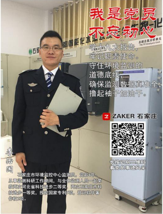 李治国,石家庄市环境监控中心监测员,党龄 4 年。从事监测科研工作期间,与全体监测人员一起荣获两次河北省科技进步二等奖,两次石家庄市科技进步一等奖,授权国家专利 7 项,登记软件著作权 2 项。