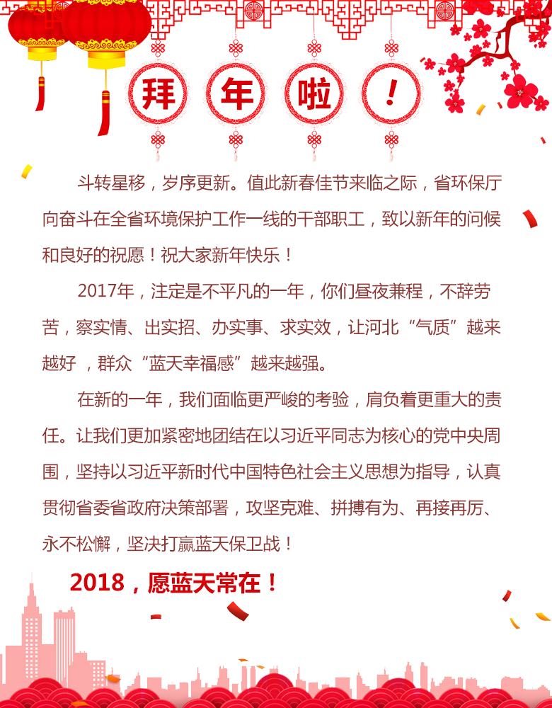 省环保厅向奋斗在环境保护工作一线的干部职工,致以新年的问候和良好的祝愿!
