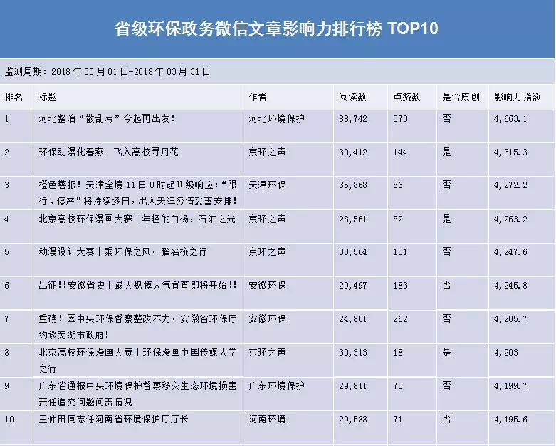 近日,中国环境新闻揭晓了3月份全国省级环保政务微信影响力排名,我厅微信公众号“河北环保发布”以总阅读量24万、影响力指数2367.2的成绩取得全国第二名。