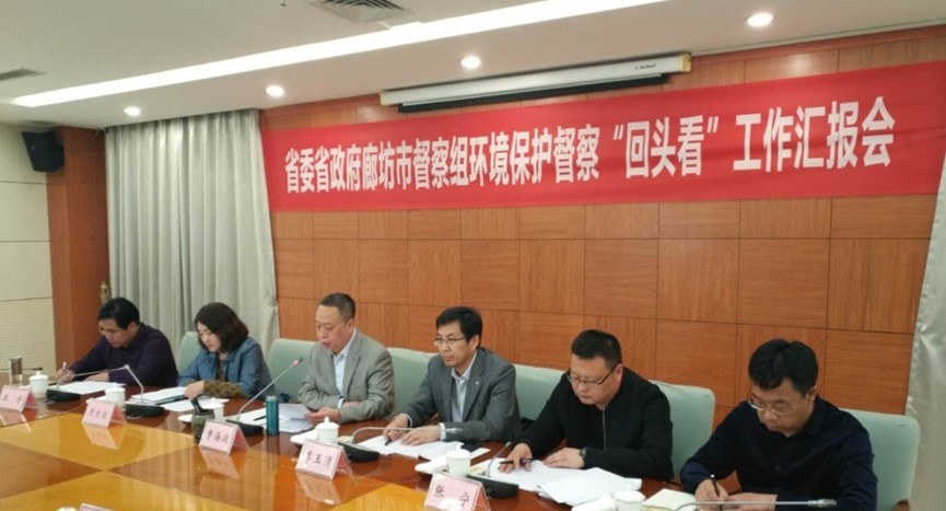 4月23日,督察组听取了廊坊市关于省委省政府环境保护督察整改工作情况汇报。廊坊市委副书记、市长陈平同志汇报了廊坊市环境保护督察整改工作完成情况及存在问题,市环保局、建设局等市直部门及11个县(市、区)主要负责同志,环保督察“回头看”领导小组成员参加会议。