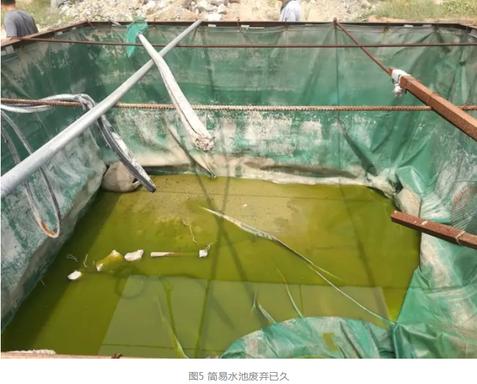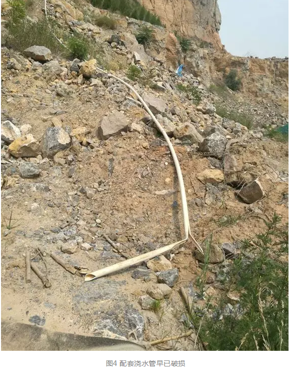 督察组现场检查时发现,上述两个矿山绿化修复范围为破坏山体,部分陡峭山体仅喷涂带有草籽的泥土,未见长草迹象。在距破坏山体3米处修建了一堵矮墙,矮墙与山体间种有3至4行柏树,树旁设有浇水管,下面有一个约8立方米的储水池。但蓄水池废弃已久,水池的水管已经破损,现场也没有发现抽水设备。此外,矿山场地周围仅有少量抑尘措施,大片土地裸露,扬尘污染严重。