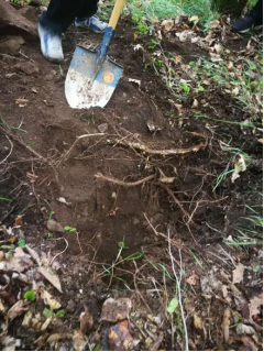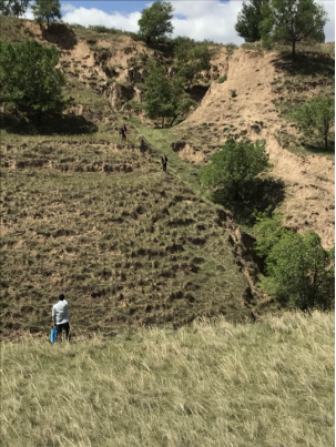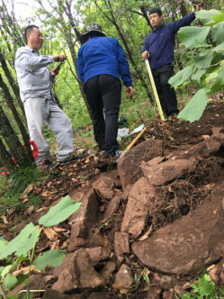 5月30日上午,采样组到达易县采样点位,发现该点位备注为耕地,实际为石质山地,基本无法采样,后经仔细查看,在不移动该点位的情况下,刨除表面植物后发现一处比较符合采样要求的地点,中午12时在炎炎烈日下艰难挖掘后最终形成斜剖面,采集样品时将大小石块基本去除,顺利完成土壤样品的采集。