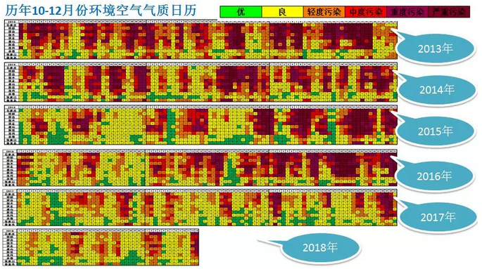 在类似不利气象条件下,对比2013-2018年10月份到12月份河北省空气质量日数据发现,2018年10月之后重污染天气发生的次数、持续时间、影响范围、浓度峰值较前几年均有明显减轻。特别是,污染物增长速率缓慢,由良轻累积增长至重度污染的时间,由原来的十几个小时,延长到现在的两天。