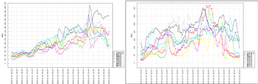 左图:11月11日0时-14日4时的PM2.5实测浓度,11-12日为污染缓慢积累阶段(本地积累),13日起为污染快速增长阶段。
