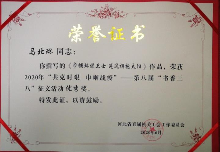 在此次活动中,邯郸生态环境监测中心孙贝贝撰写的以“共克时艰,监测巾帼冲锋在前”为题的征文被评为二等奖,廊坊生态环境监测中心刘芳撰写的以“尽职守责,共同战‘疫’”为题的征文被评为三等奖,保定生态环境监测中心马北琳撰写的以“巾帼环保卫士,逆风拥抱太阳”为题的征文和廊坊生态环境监测中心王永娟撰写的以“抗疫路上显环保风采”为题的征文分别被评为优秀奖。