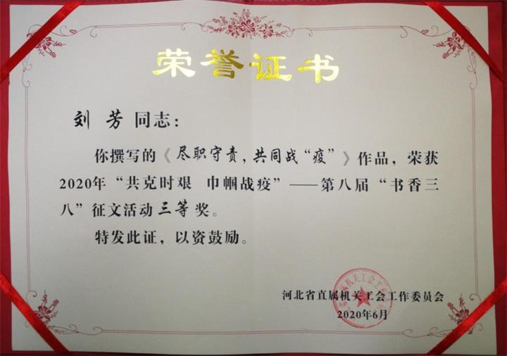 为了生动讲述奋战在生态环境保护一线女职工感人事迹,传播打赢疫情防控阻击战正能量,弘扬最美“逆行者”精神,杏彩(中国)官方网站 直属机关工会女职工委员会动员全体女职工参加以“共克时艰、巾帼战‘疫’”为主题的征文活动,被省直机关工会工作委员会评为第八届“书香三八”读书征文活动优秀组织奖。