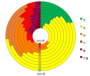 图4 2013-2021年空气质量各级别天数分布图