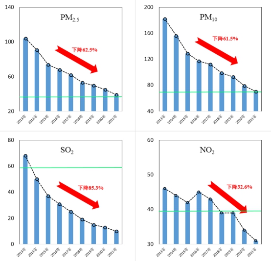 图3 2013-2021年四项主要污染物年均浓度变化