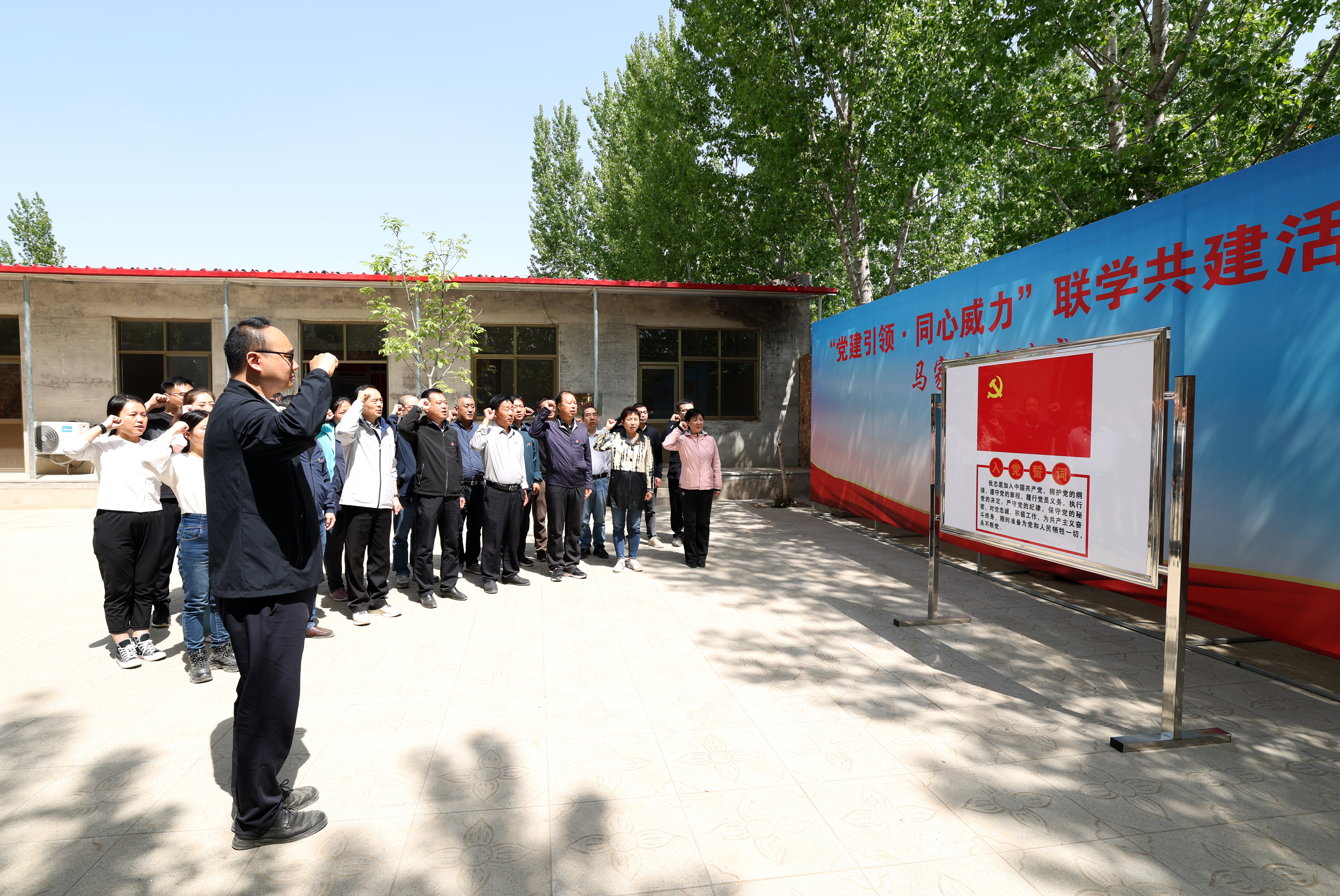 重温入党誓词。主题党日活动中,参加联学共建的党员干部在驻村工作队驻地,面对鲜红的党旗,重温入党誓词,坚定理想信念,牢记初心使命,用笃行实干践行誓言,争做生态环境保护铁军。