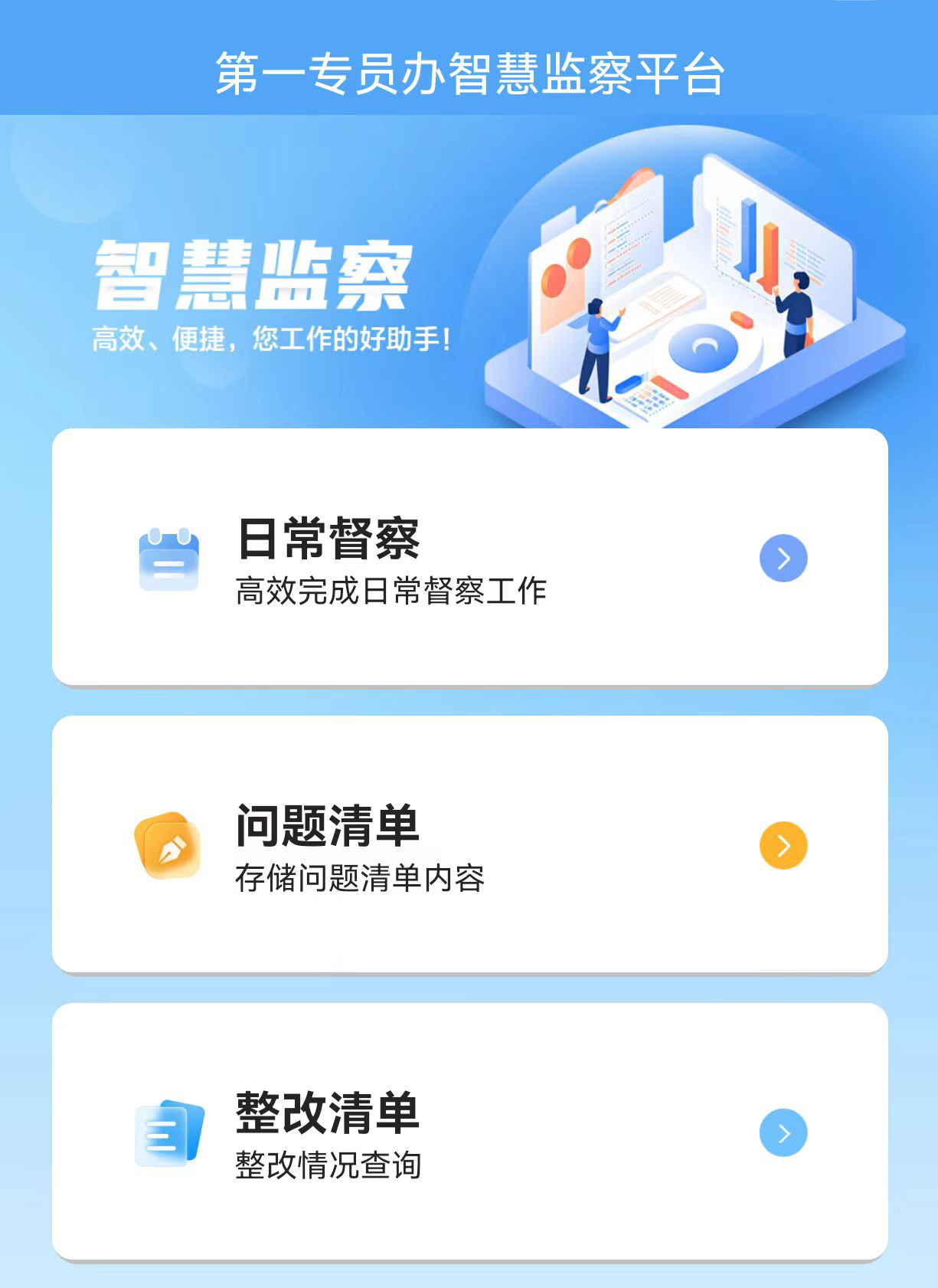 “智慧监察平台”由数据库和手机APP两大部分构成,其中手机APP功能分为日常督察、问题清单、整改清单、数据统计、环保手册、工作动态和学习园地等7个板块,可实现监察情况现场录入、实时提交、分级审核、集体会商、追溯查阅等功能。