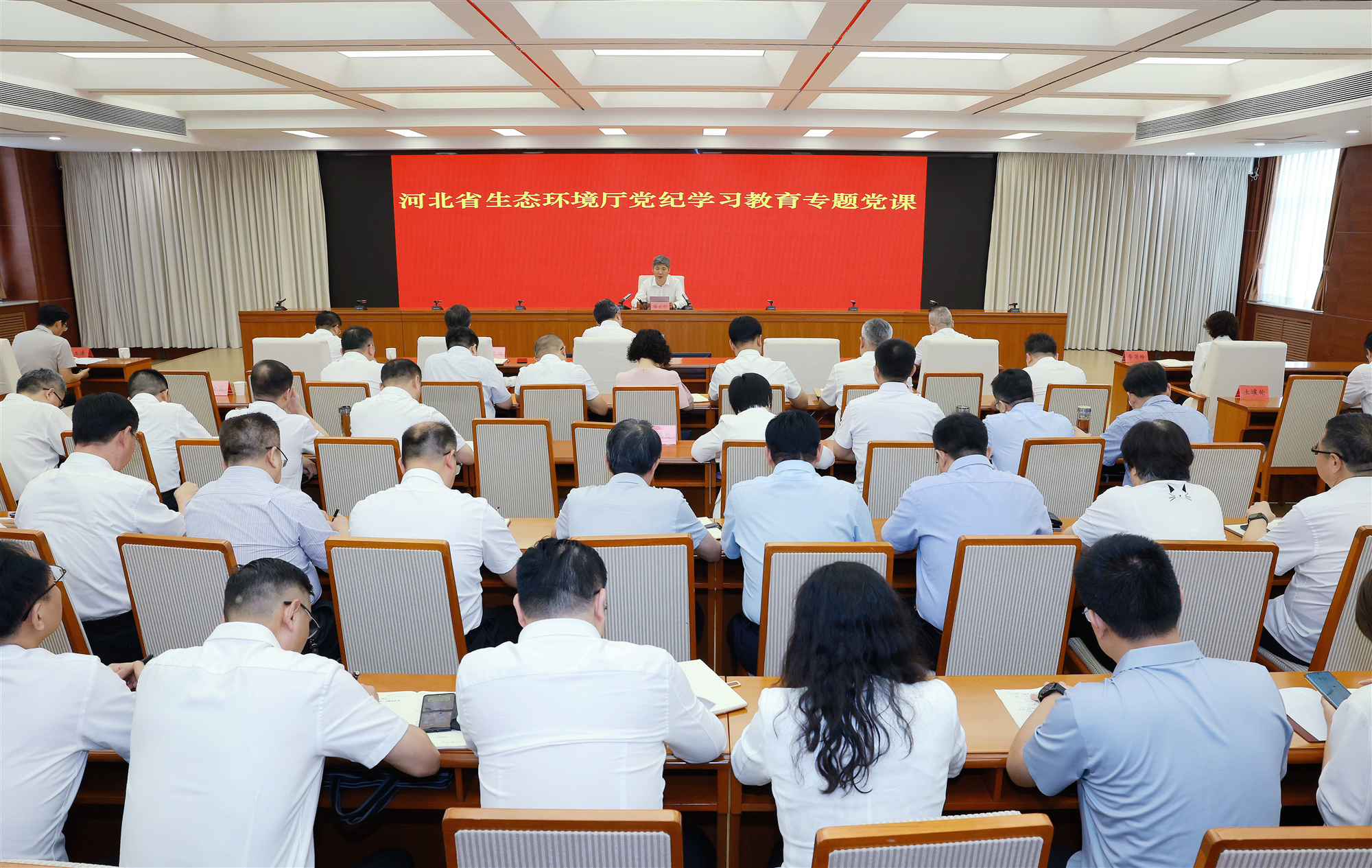 召开党纪学习教育专题党课,厅党组书记、厅长梅世彤主持会议并讲纪律党课。他强调,要深刻学习领会习近平总书记关于全面加强党的纪律建设的重要论述,深入开展党纪学习教育,引导全厅党员干部在学纪、知纪、明纪中严守“六大纪律”,真正把遵规守纪刻印在心,内化为日用而不觉的言行准则,不断增强遵规守纪的政治自觉、思想自觉、行动自觉,为加快建设天蓝、地绿、水秀的美丽河北提供坚强保障。