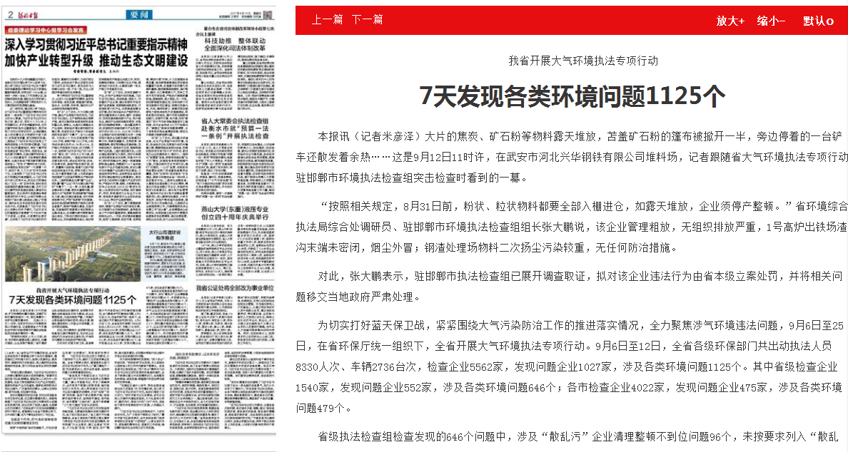 为切实打好蓝天保卫战,紧紧围绕大气污染防治工作的推进落实情况,全力聚焦涉气环境违法问题,9月6日至25日,在省环保厅统一组织下,全省开展大气环境执法专项行动。9月6日至12日,全省各级环保部门共出动执法人员8330人次、车辆2736台次,检查企业5562家,发现问题企业1027家,涉及各类环境问题1125个。其中省级检查企业1540家,发现问题企业552家,涉及各类环境问题646个;各市检查企业4022家,发现问题企业475家,涉及各类环境问题479个。