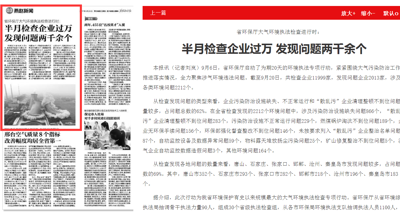 燕赵都市报:省环保厅大气环境执法检查进行时: 半月检查企业过万发现问题两千余个